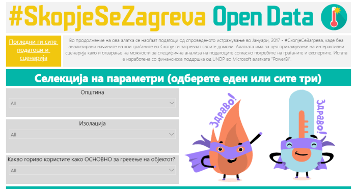 Во јануари 2017, УНДП, во соработка со Град Скопје и Министерството за животна средина и просторно планирање, спроведе теренско истражување за начинот на кој се греат домаќинствата, со примерок од 5044 домови во Скопската котлина. Заклучоците на ова истражување покажаа дека греењето е најголемиот допринесувач кон загадувањето во Скопската котлина, со тоа што греењето во домаќинствата има најголем удел. Како производ на ова истражување, #SkopjeSeZagreva беше креирано, со цел да се престават податоците визуелно, со отворен пристап за сите.